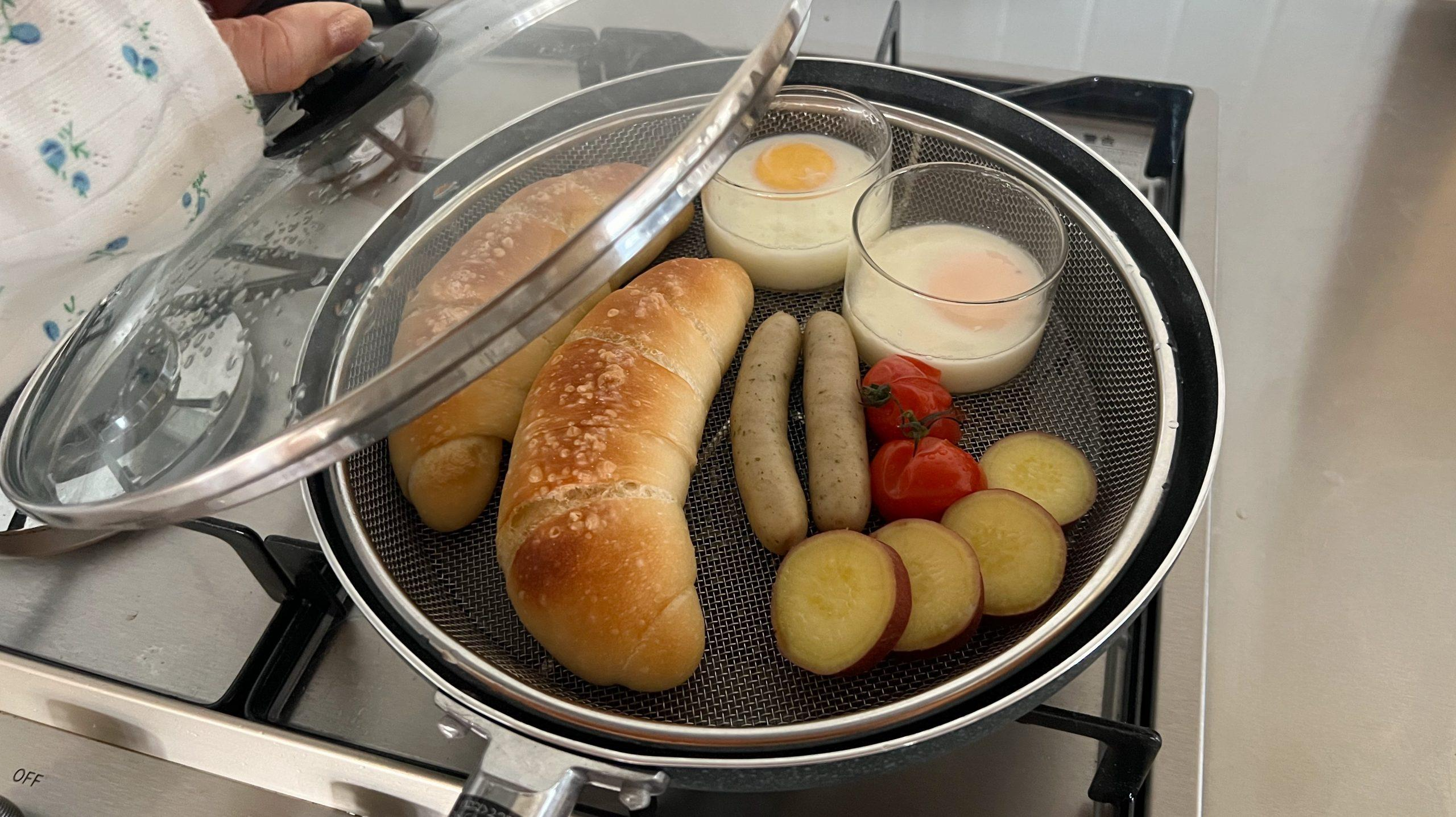 冷凍ストックしているパンや耐熱容器に入れた卵、ウインナーや野菜たちを入れて、10分ほど蒸すだけであっという間に理想的な朝食ができるんです。