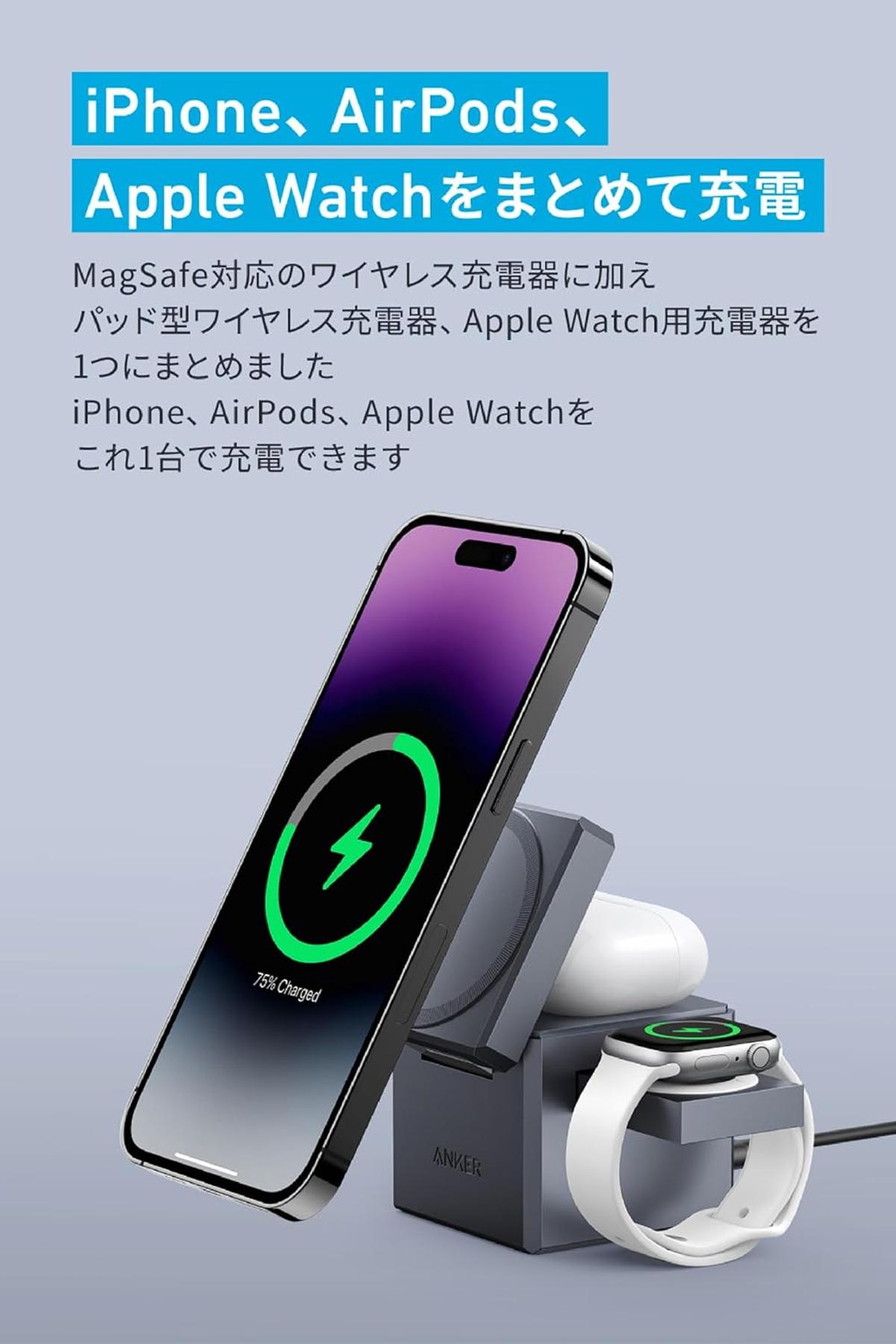 MagSafe対応の充電器となっており、iPhoneやAirPods、さらにはApple Watchまで同時に充電できちゃうスグレモノ。