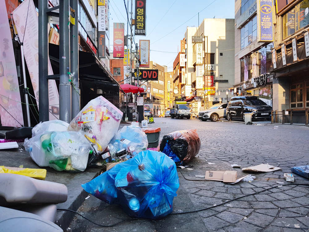 韓国では法律で指定ゴミ袋の使用が義務付けられていて、日本でいう「指定ゴミ袋制度」と同じ仕組みだが韓国の方がより厳しい。1995年から全国一斉に導入されスーパー・コンビニ・区役所などで販売している。袋自体に料金が含まれている(捨てる量が多いほどお金がかかる仕組み)わけだ。