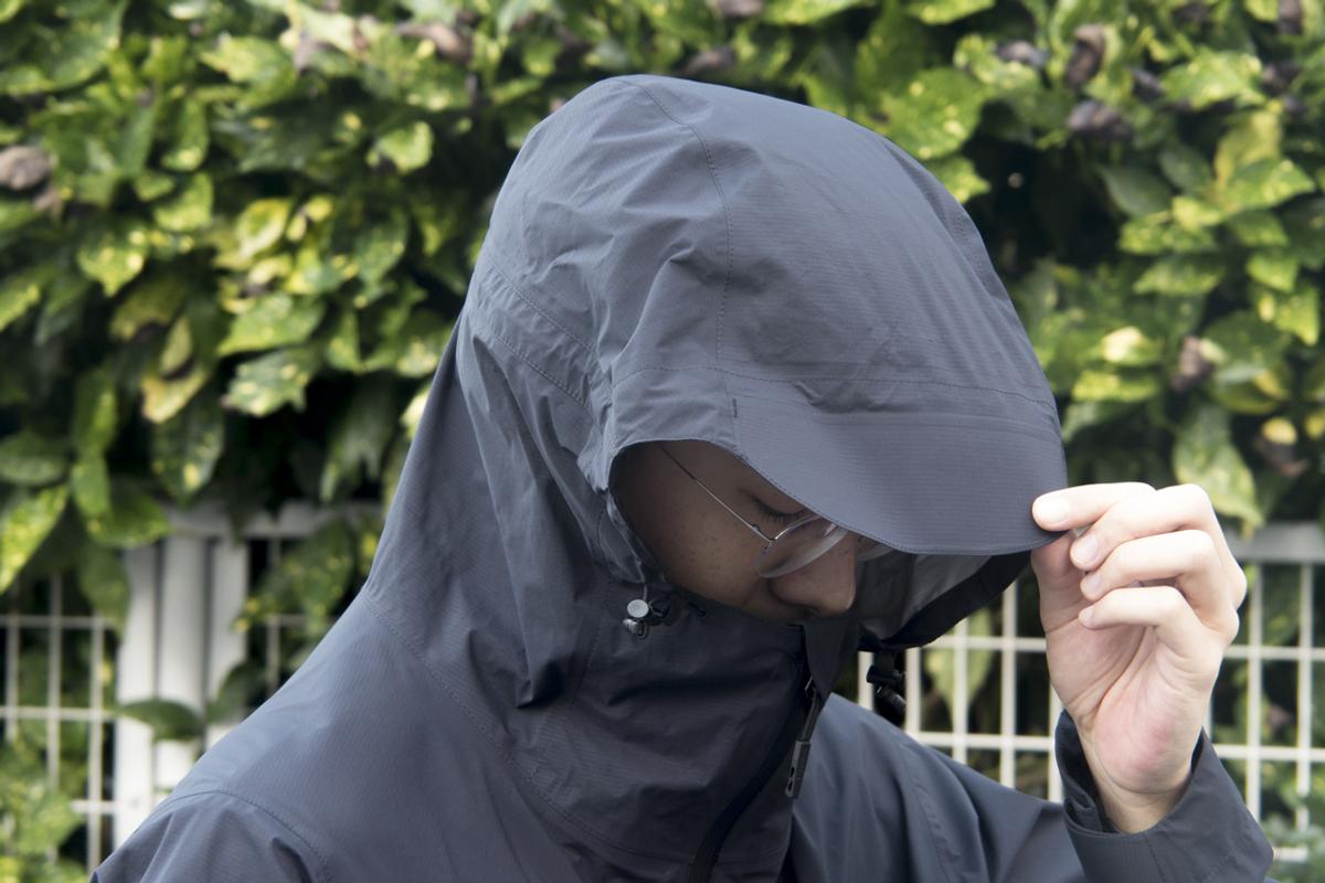 ドローコードでフィット感の調節が可能なフードには、柔らかいツバがついているので、雨天時でも視界が確保しやすく実用的。