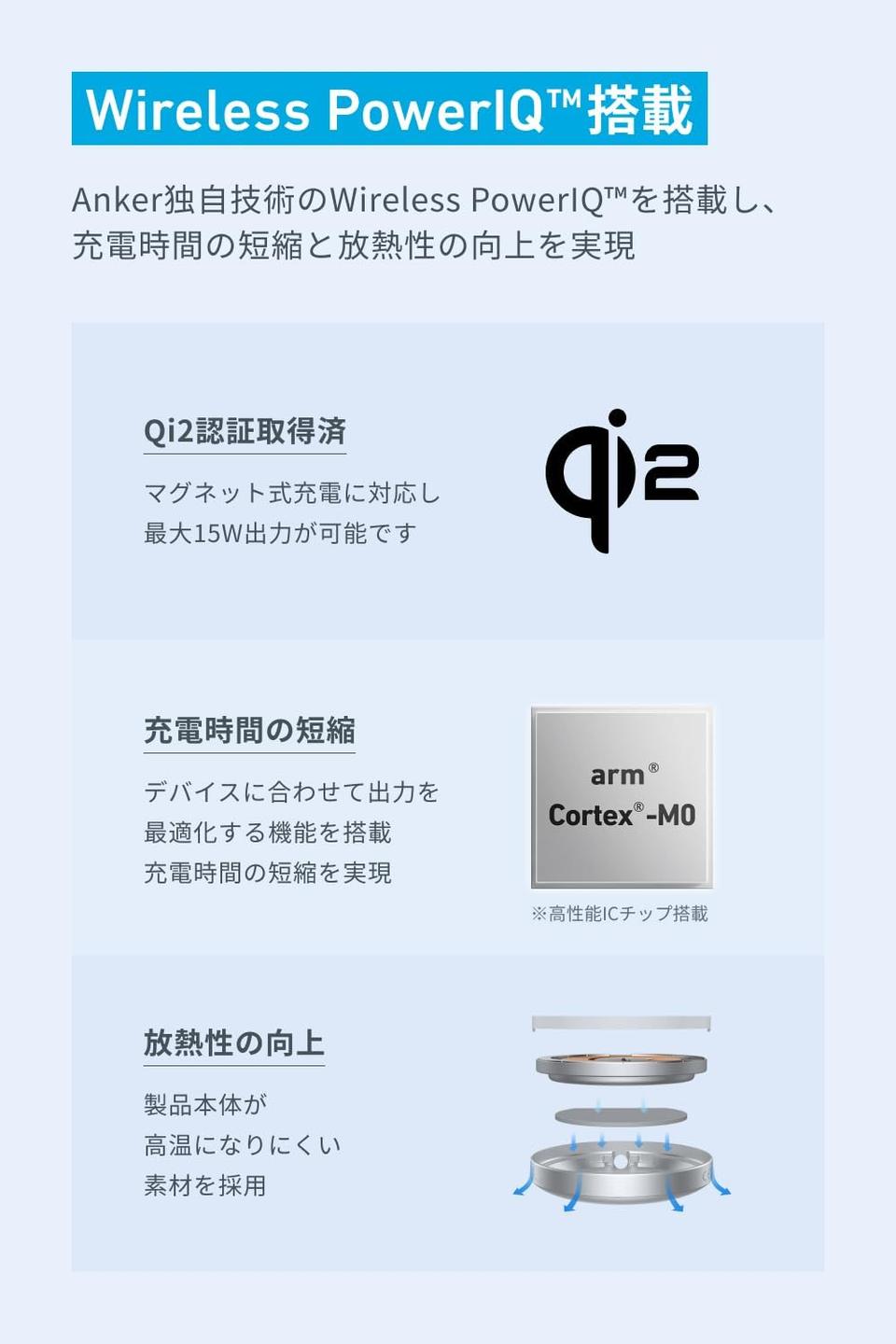 高性能ICチップ「Wireless PowerIQ」を内蔵しており、機器に合わせて出力を最適化。効率的に充電ができ、放熱性も向上しているから安全に充電できますよ。
