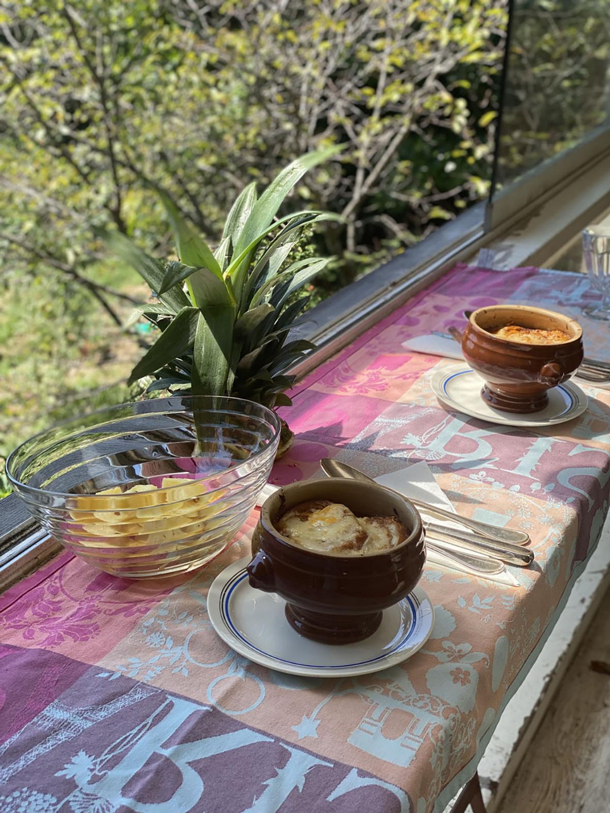 玉ねぎがいっぱいあるのでTORUくんに「オニオン・グラチネ」を作ってもらった。熱いスープを激暑のデッキで食べた、火傷するほど熱いスープが美味しいとは意外! 途中で食べるパイナップル、これがまた美味。