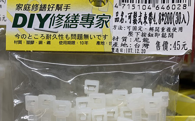 ブホッ、なんとも正直すぎる(笑)。。。耐久性「も」ということは、他も問題無いということですね! 商品のタグを見ると「使用期限:10年」とありますから、台湾民国107年(西暦で2018年)製造なのであと9年以上は大丈夫そうです、今のところ。もちろん、形ある物いつかは壊れる。この「結束バンド」もいつかは劣化するでしょうけど、それにしても正直すぎて、じわじわきますね。