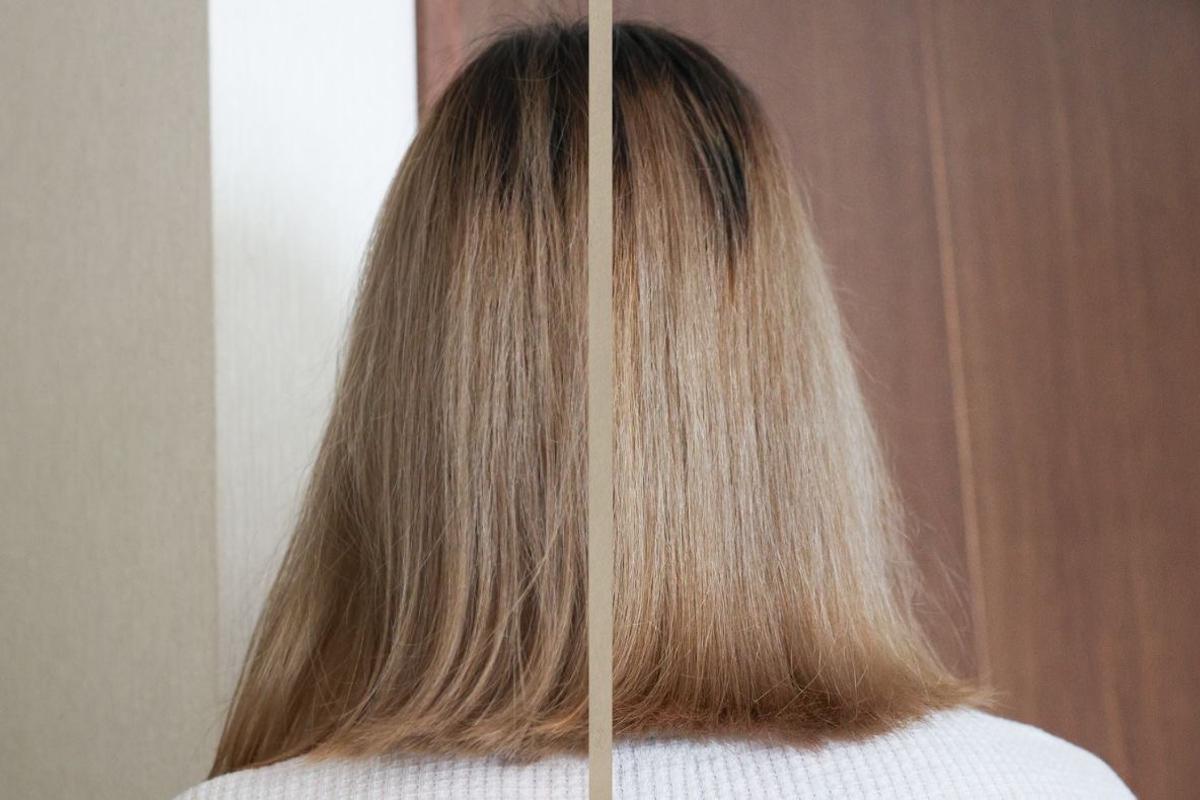 今まで使っていた他社のドライヤーで乾かした状態(左)と、今回のブーストイオンドライヤーで乾かした状態(右)を比較してみました。