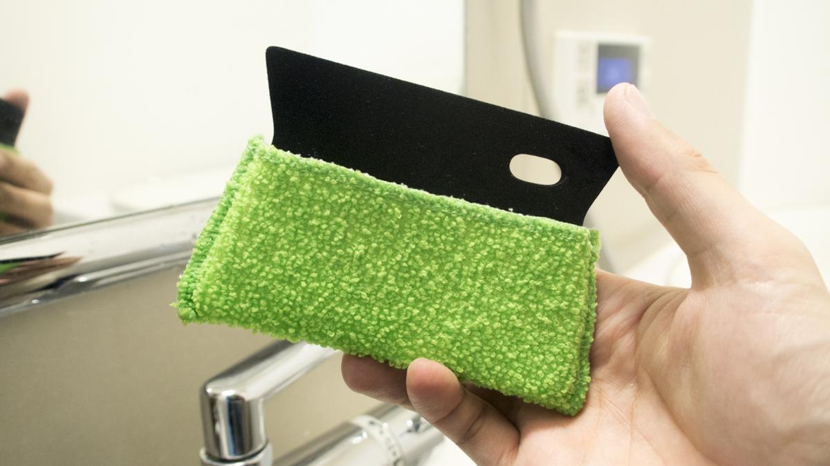 使い方は簡単! お掃除したい部分を水で濡らして、緑色の面でこすり洗いしてスキージーで水を切るだけ。
