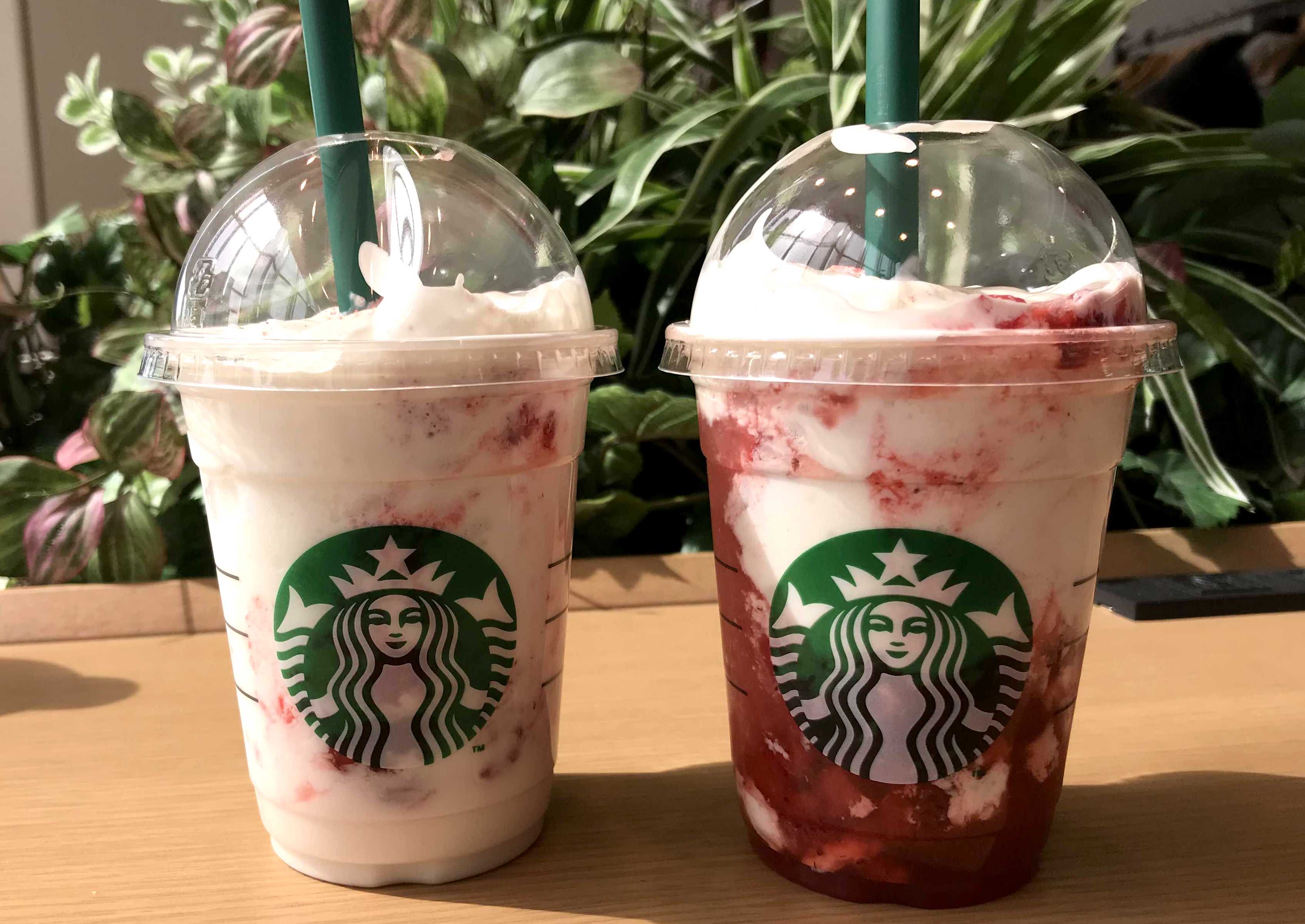 左が新メニューの「#ストロベリーベリーマッチフラペチーノ(R)ホワイト」で、右が「#ストロベリーベリーマッチフラペチーノ(R)レッド」です。まずは新作のホワイトから!