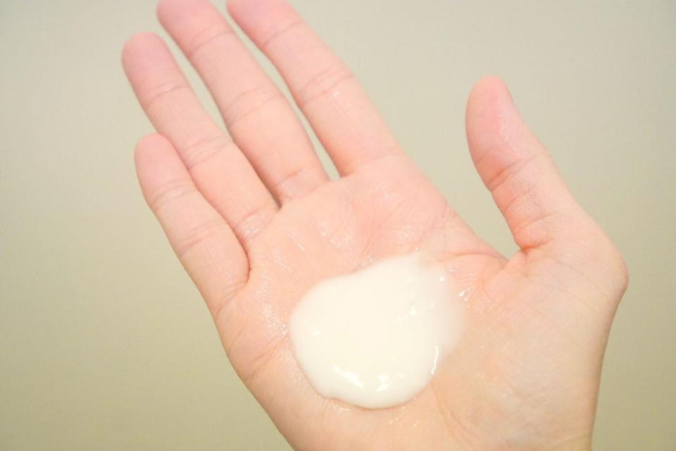 手に伸ばすと20〜30秒ほどで、肌になじみます。最初は手を合わせるとピトッとしていますが、次第にサラサラに。
