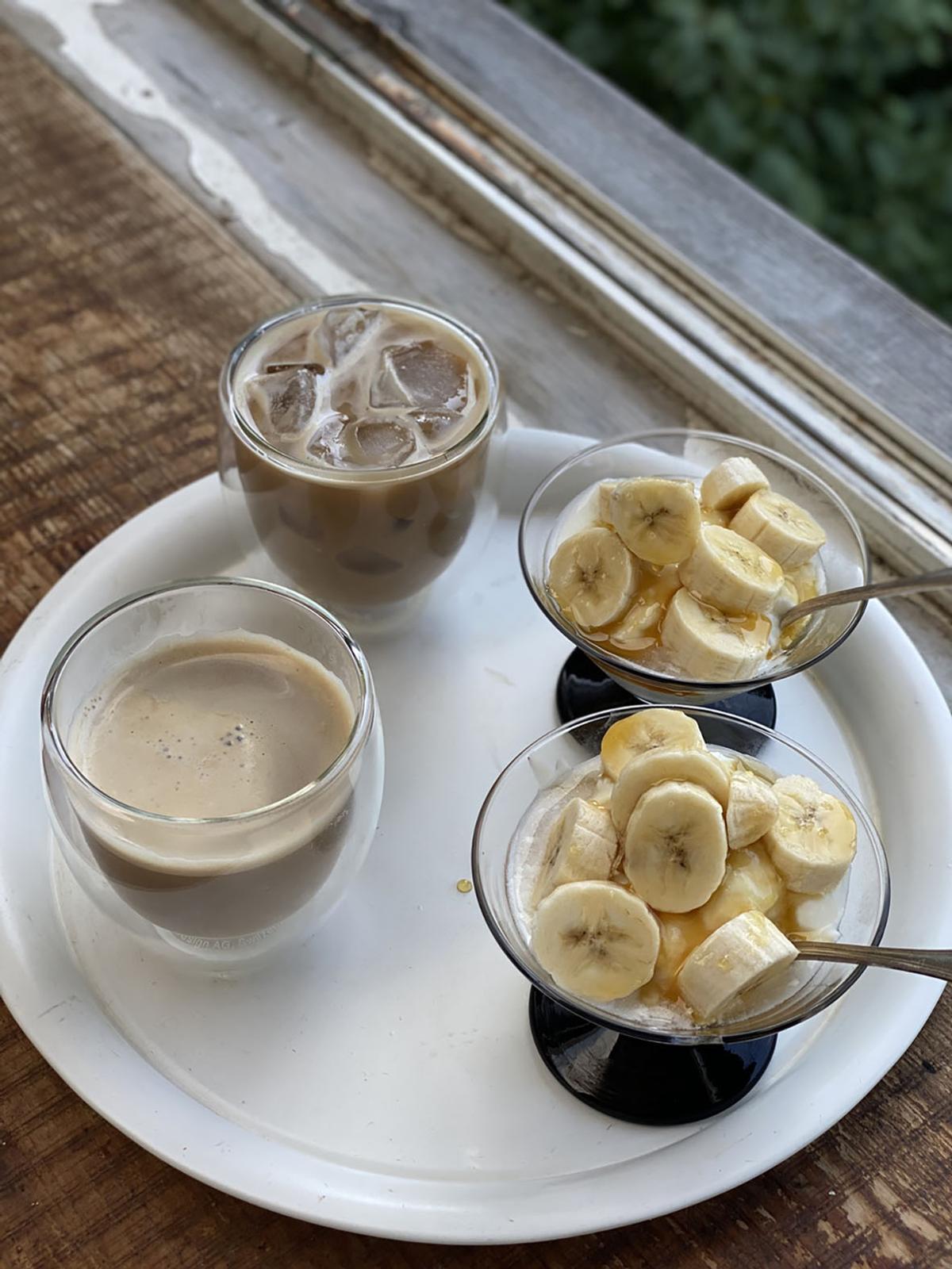 冷たいカフェオレ、バナナヨーグルト。TORUくん、運転免許の更新に出かける。