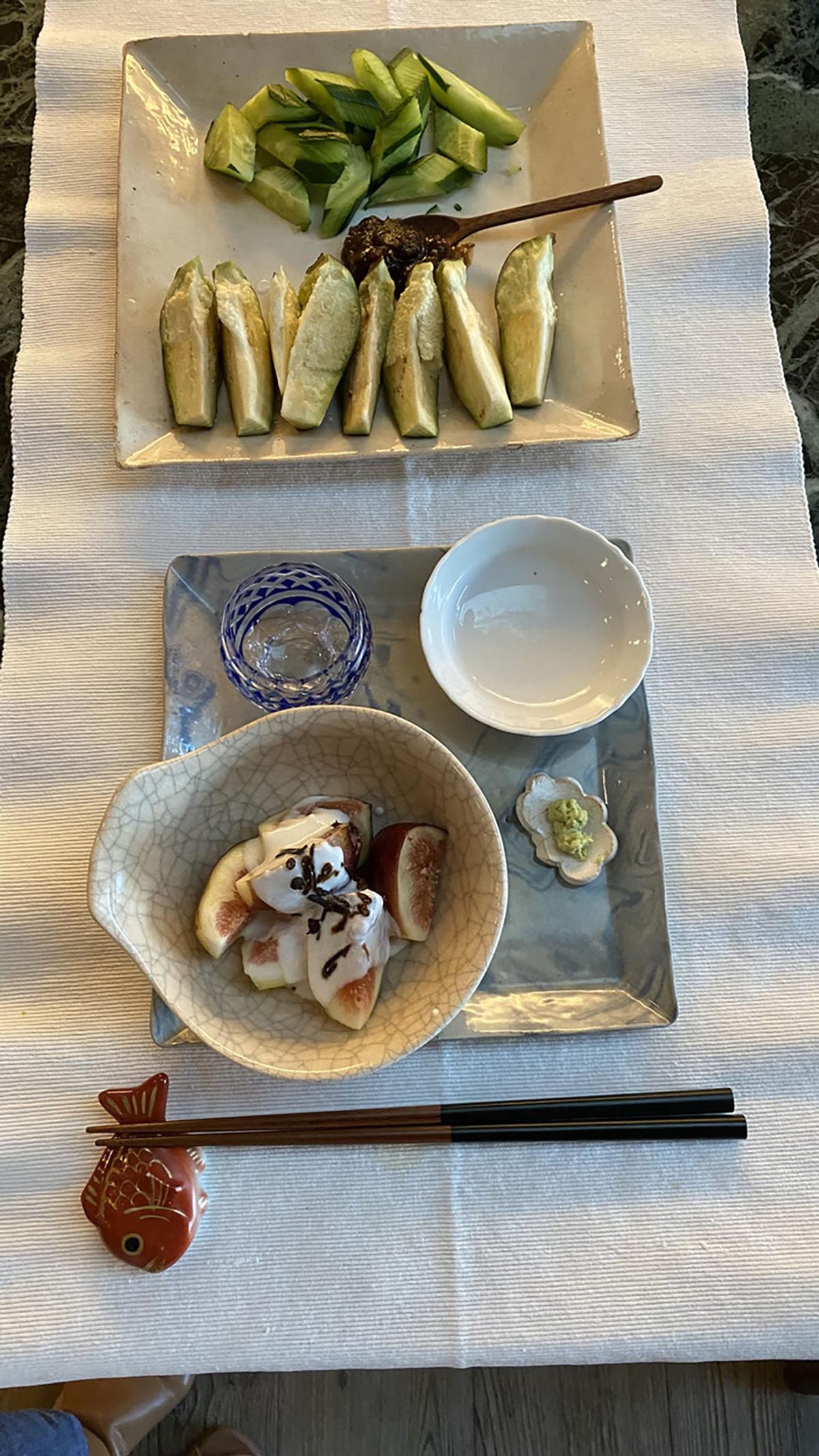 イチジクの塩麹とヨーグルト和え、キュウリと水ナス(梅醤つけて)、