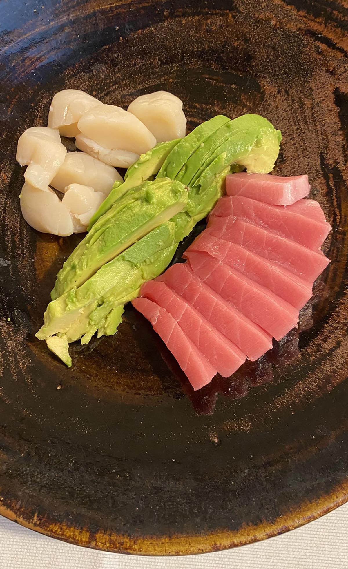 中とろとホタテとアボカド(わさび醤油)。