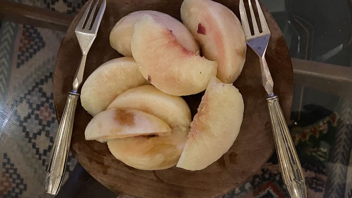 桃。あ〜〜ぁ、お夕飯はどれも美味しかったのでホッとしたのだが、お昼の負け戦が心に痛い。