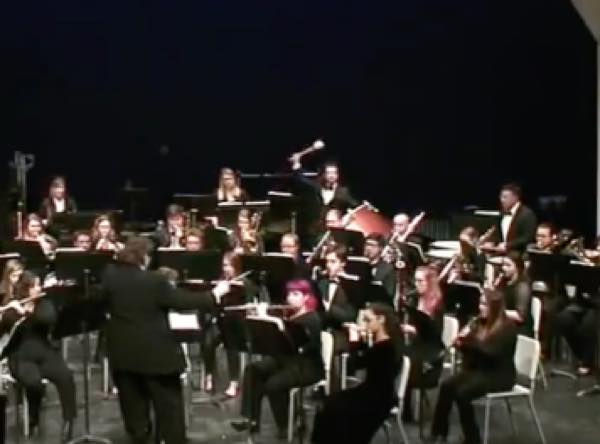 中央の後ろの方にいるバスドラム奏者に注目。勢いよくドラムを叩いていたのだが・・・
