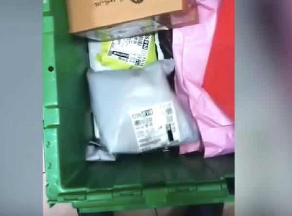 宅配便の荷物の仕分け現場の映像か、もしくは配達前だろうか、様々な荷物が集まっている。