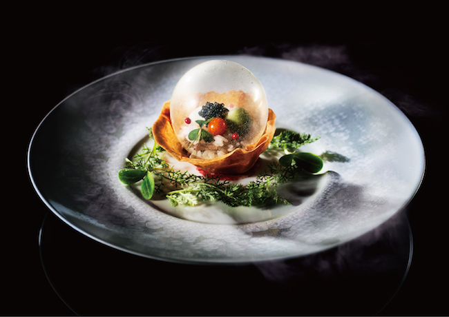 森の中で二人きりで過ごす幸福を、森の恵みのポルチーニ茸とトリュフ塩が祝福します。半透明なゼラチンドームに包むことで、誰にも邪魔されない二人だけの王国をおにぎりにしました。