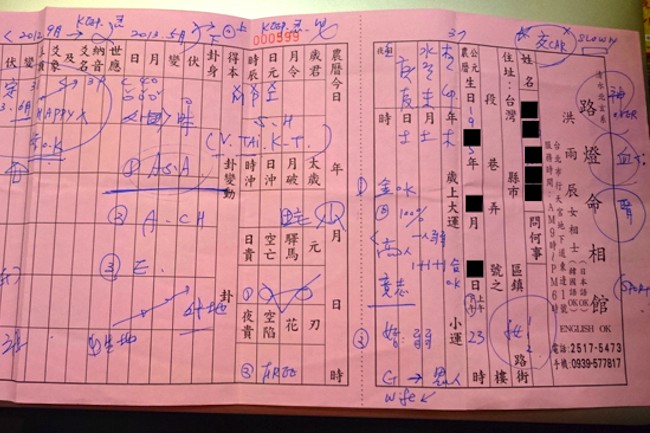 さっそく座って話をすると、洪さんは四柱推命、手相、米掛け(コメ占い)の3種類を観て、それらの結果を総合して、運勢を出します。名前や生年月日、生まれた時刻まで細かく問われたあと、ピンク色の専用紙になにやら書き始めたのです。