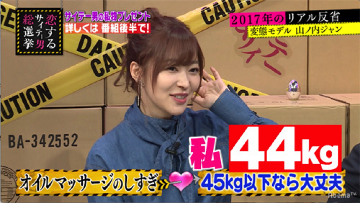 テーマ「2017年のリアル反省」では、サイテー男の皆に、2017年リアルに反省したことを表す写真を披露してもらった。モデルの山ノ内は、腰にサポーターを巻いた写真を披露し「今年この番組のおかげで、有名になってきて、女性との夜の回数も増えたんですよ。その影響で腰を痛めてしまった」と告白し、さらに「医者に椎間板ヘルニアの予備軍と言われ、僕のことを知っているのか、『山ノ内さん、45kg以下の子を上に乗っけるなら大丈夫です。それ以下なら、その腰は耐えられる』と言われた。だから今、45kg以下の子を探している」と続けたところ、それを聞いていた小杉が「1番売れている時の(レイザーラモン)HGも腰痛めたから、HGくらい腰振っているってことや」とコメントし、スタジオに笑いが起きた。