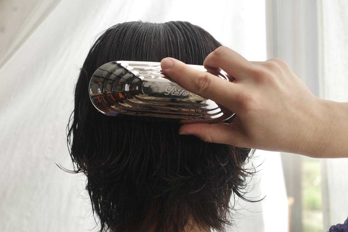 シャンプーをしっかり泡立てたあと、写真のようにブラシを髪の根元から毛先に向かってすべらせるように使います。