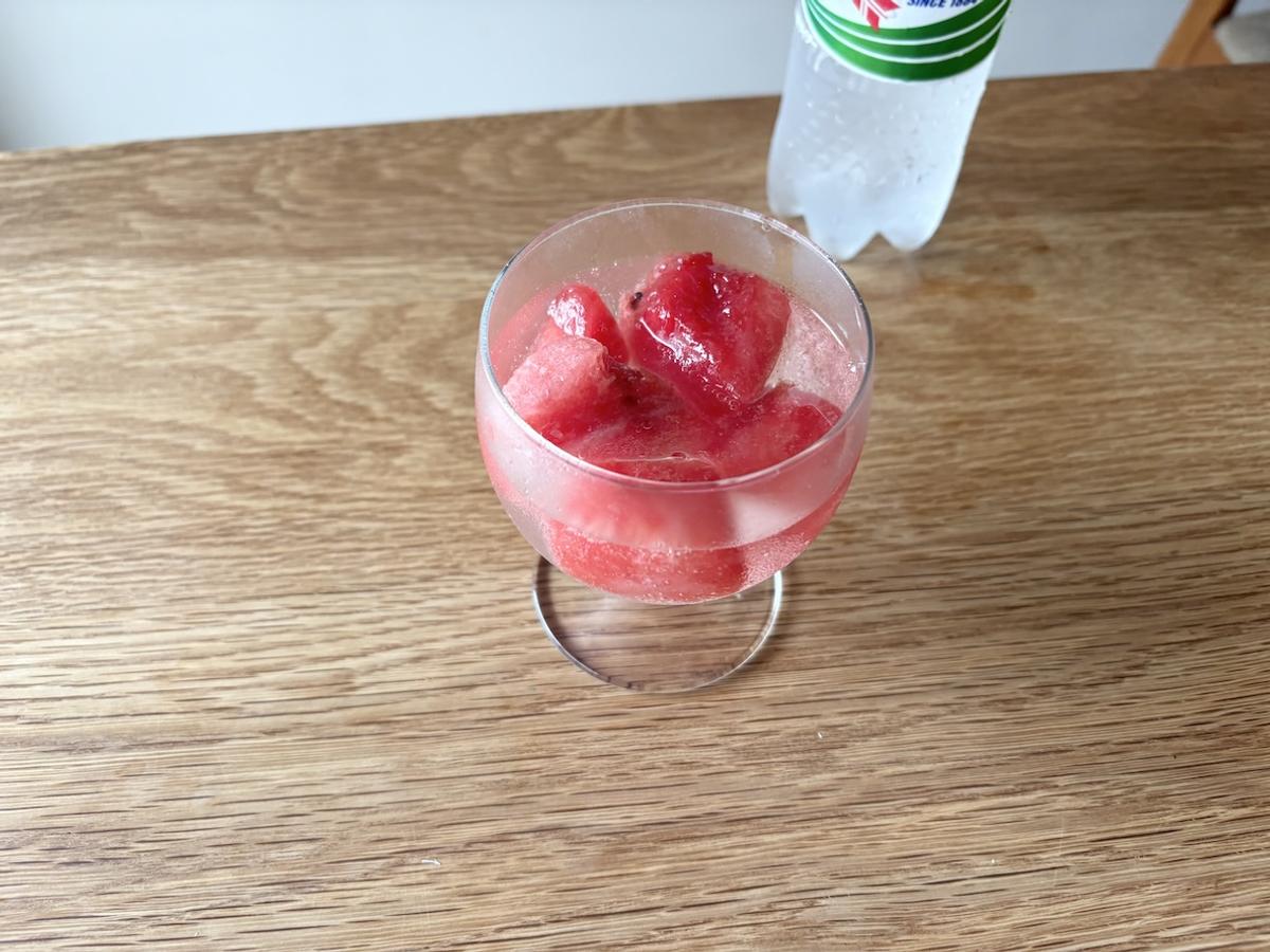 冷凍スイカにサイダーを注ぐ。サイダーを少なめにすればフルーツポンチ風に。