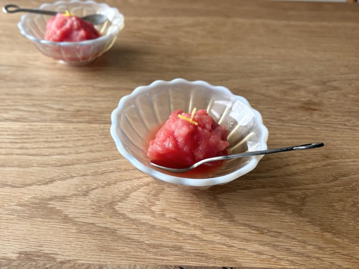 半解凍した冷凍スイカとレモン汁、はちみつをフードプロフェッサーなどで撹拌する。