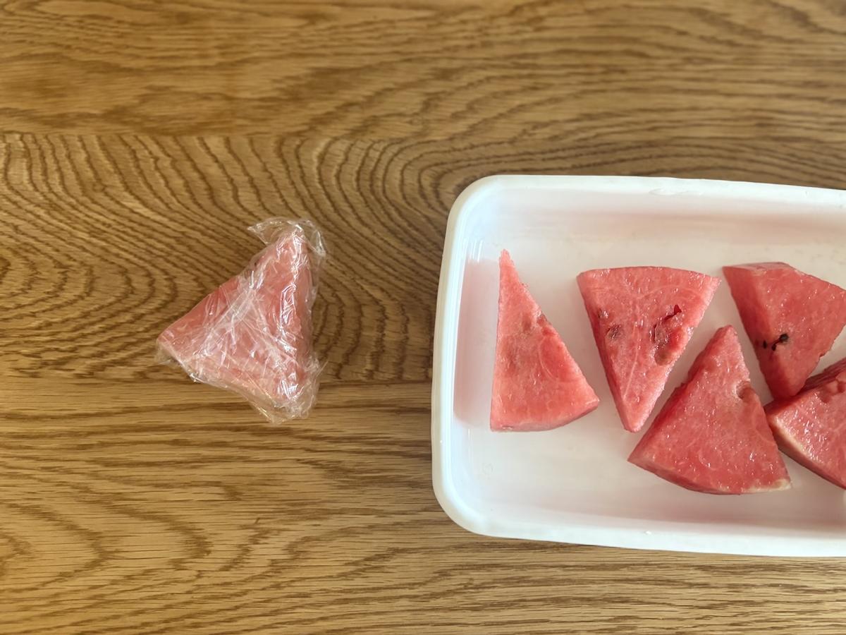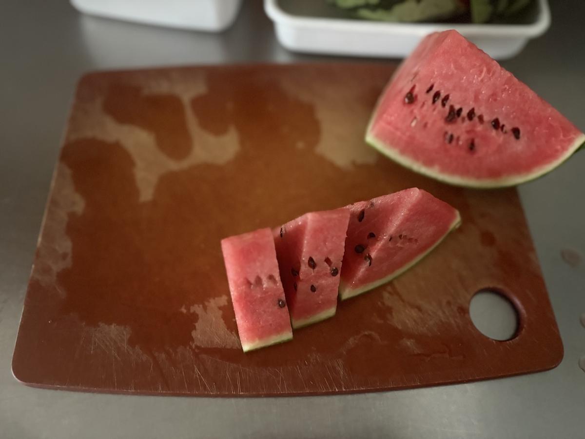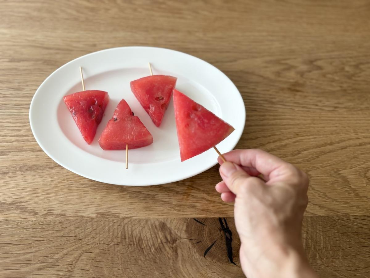 そして三角形にカットしたスイカは、こんな風にスティックを刺して並べるだけ。来客時にぴったりです。
