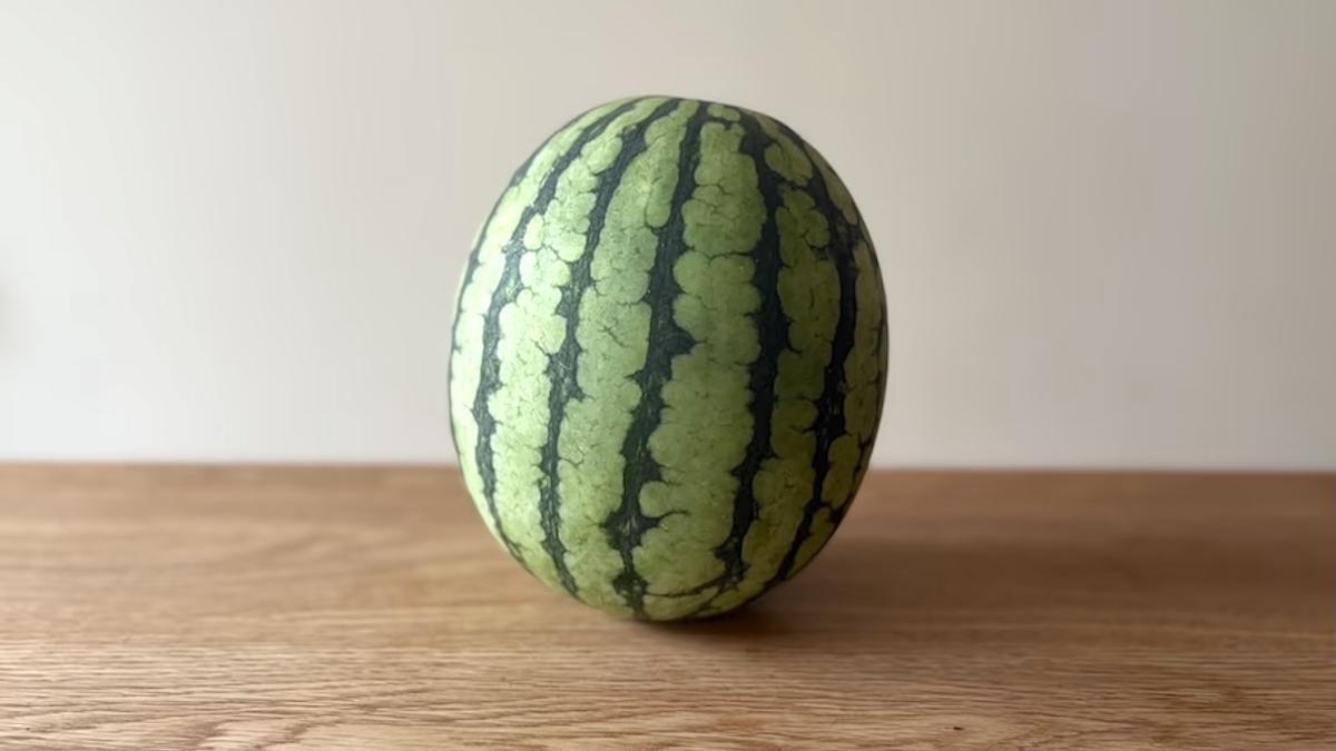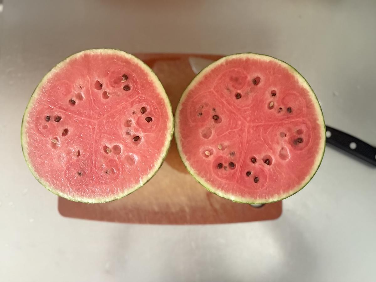 1. 縞々と垂直に包丁を入れて半分にカットし、種が見える位置で放射線状にカットする(断面に種が並ぶため取りやすくなります)。