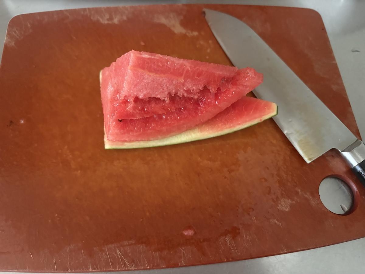 1. 放射線状にカットした後、断面が大きい側から三角形になるようにカットし、皮を切り離し、種を取り除く。