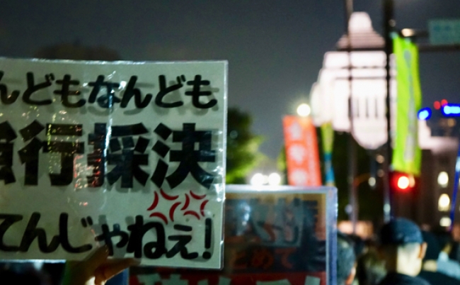 14日夜、東京・永田町の国会議事堂前には、法案に反対する数千人の人々が集まり、攻防が続いた「良識の府」に向かって、「強行採決、絶対反対」などの声を挙げていた。(随時更新)