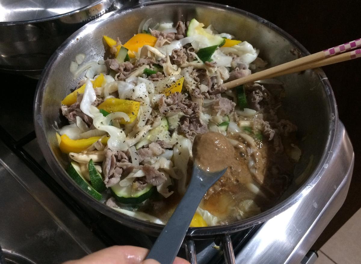 野菜がしんなりして火が通ったら、先ほど茹でた平太春雨と、お好みのお肉や魚介を入れます。