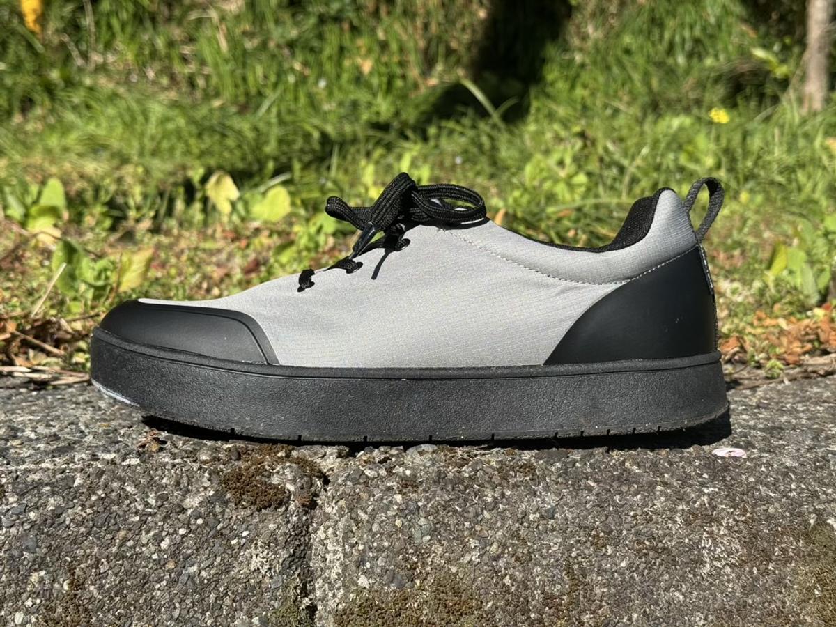 防水シューズというと、どうしても「登山靴っぽい」見た目になりがちですが、このモデルはかなりシンプル。