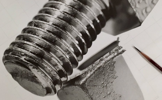 下の弟はえんぴつで精密な絵を描くのが得意なんだけど、最近はずっと、このボルトとナットを描いていて、さすがにすこし狂気を感じる。これは、240時間目の状態(未完成)だそうです。写真じゃないんです… pic.twitter.com/mbFoW2KCqI