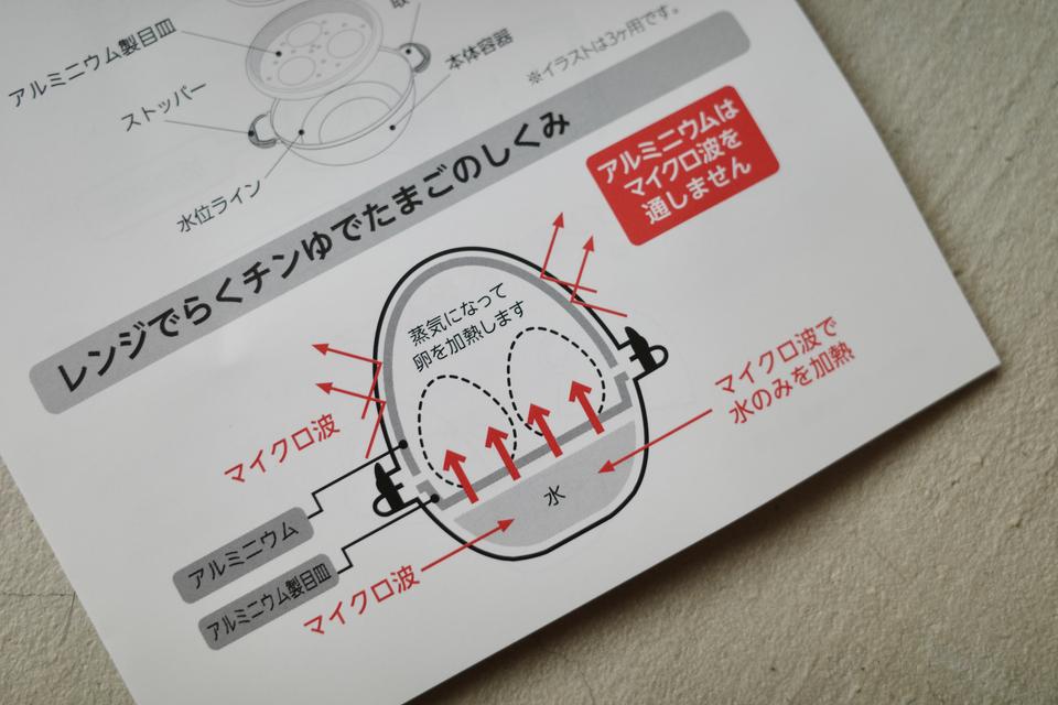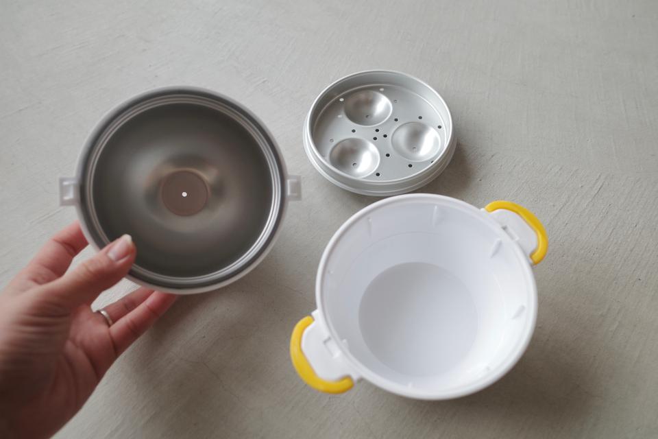 たまごを覆うドーム型のフタとたまごをセットするお皿は、電子レンジのマイクロ波を通さないアルミニウムでできています。一方、プラスチック製の下層部に入れられたお水はマイクロ波で加熱され、蒸気が発生。この蒸気がたまごを加熱してゆでたまごにしてくれる、というわけです。