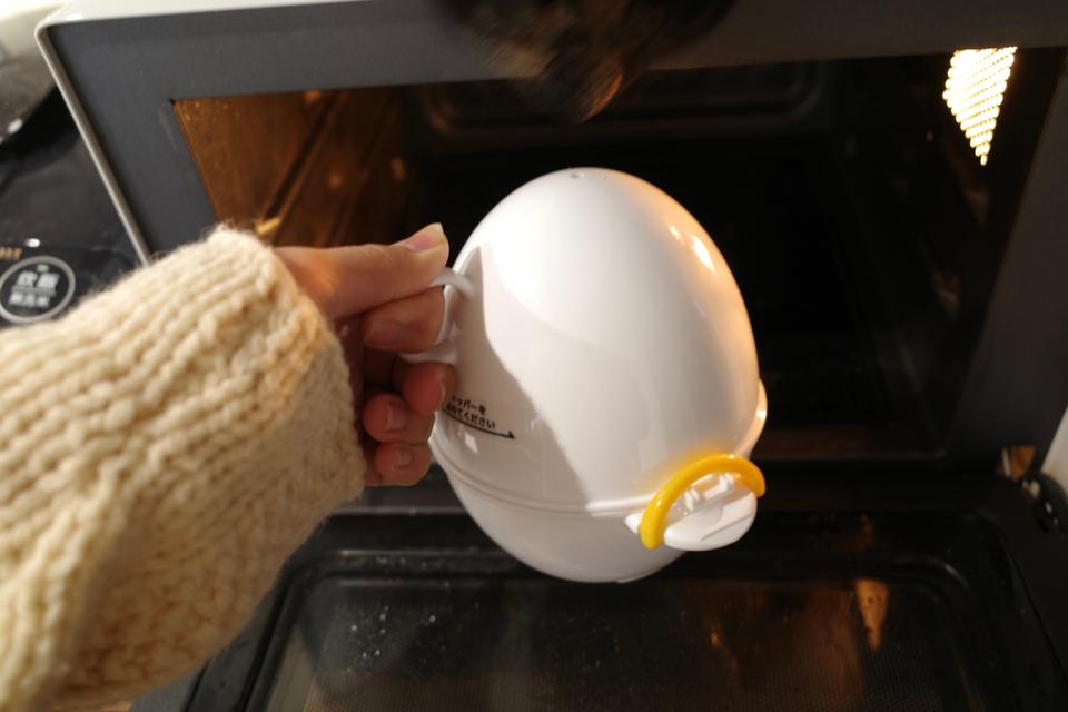 使い方は、たまご型の容器に水を入れ、たまごをセットしたら、ふたをしてレンジでチン。あとは放置して余熱調理するだけで簡単にゆでたまごができちゃう優れものなんです。