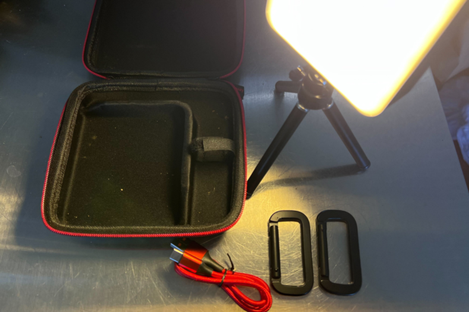 本体用のType-C充電ケーブル、卓上で使える三脚と、テントやベランダなどで吊して使用できるカラビナが2つ付いてきます。また、本体の背部には強力な磁石が内蔵されているので、冷蔵庫や車などに設置してもOK。