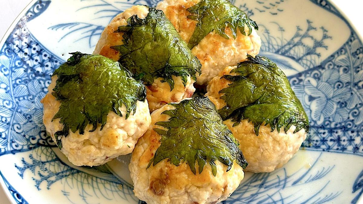 大葉をくるっと巻いて焼いたら、桜餅のようなかわいい見た目で、香りもよいふんわりバーグができました。