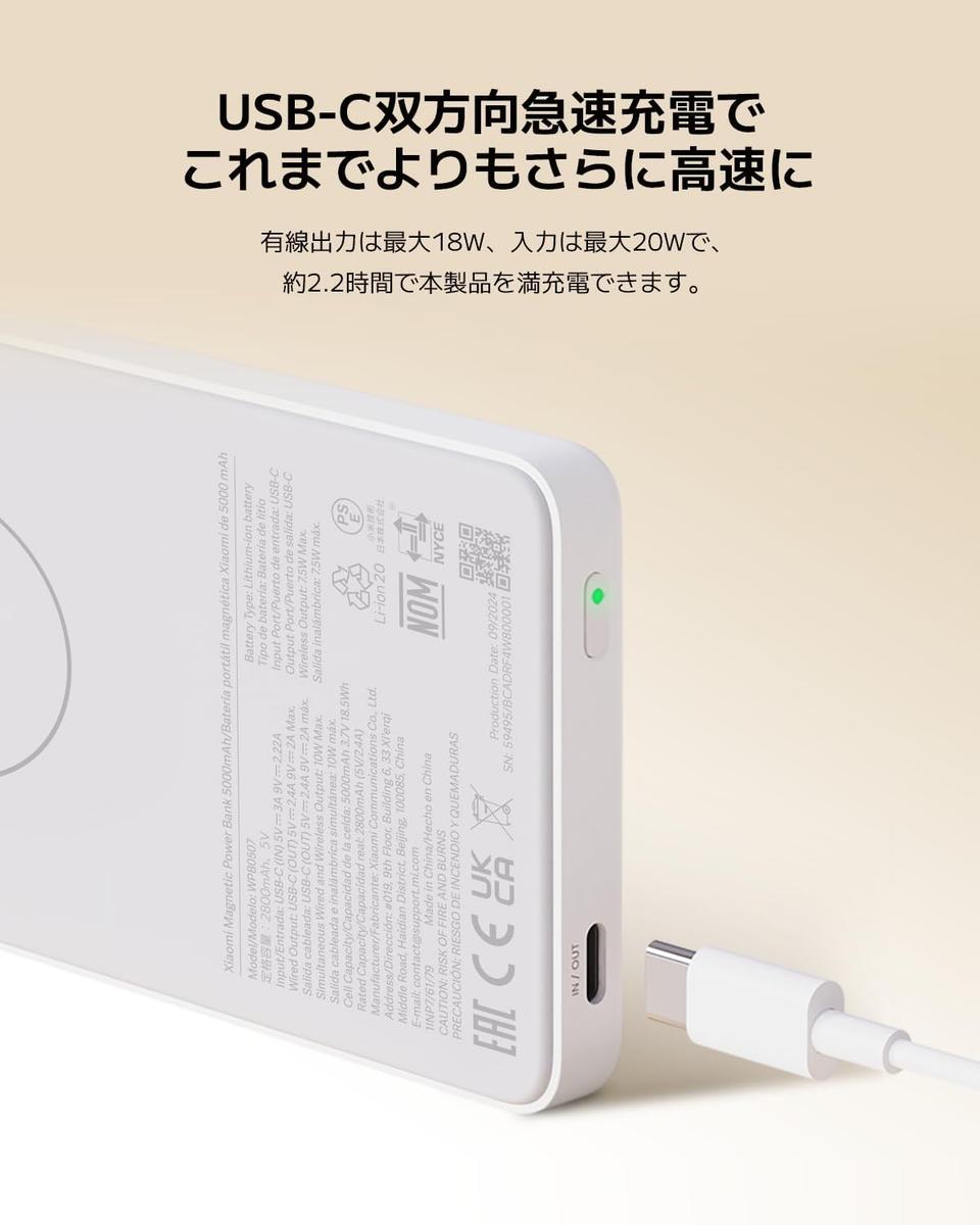 「7.5W Magnetic Power Bank 5000mAh」の有線出力は最大18W、入力は最大20Wで、約2.2時間で本製品を満充電することが可能。