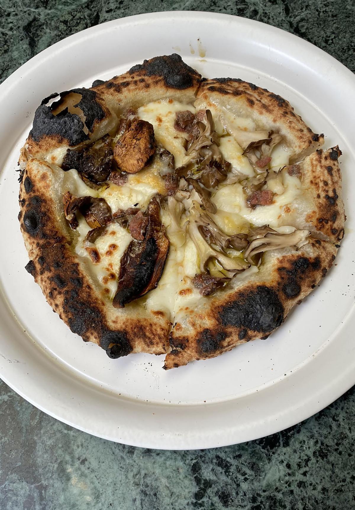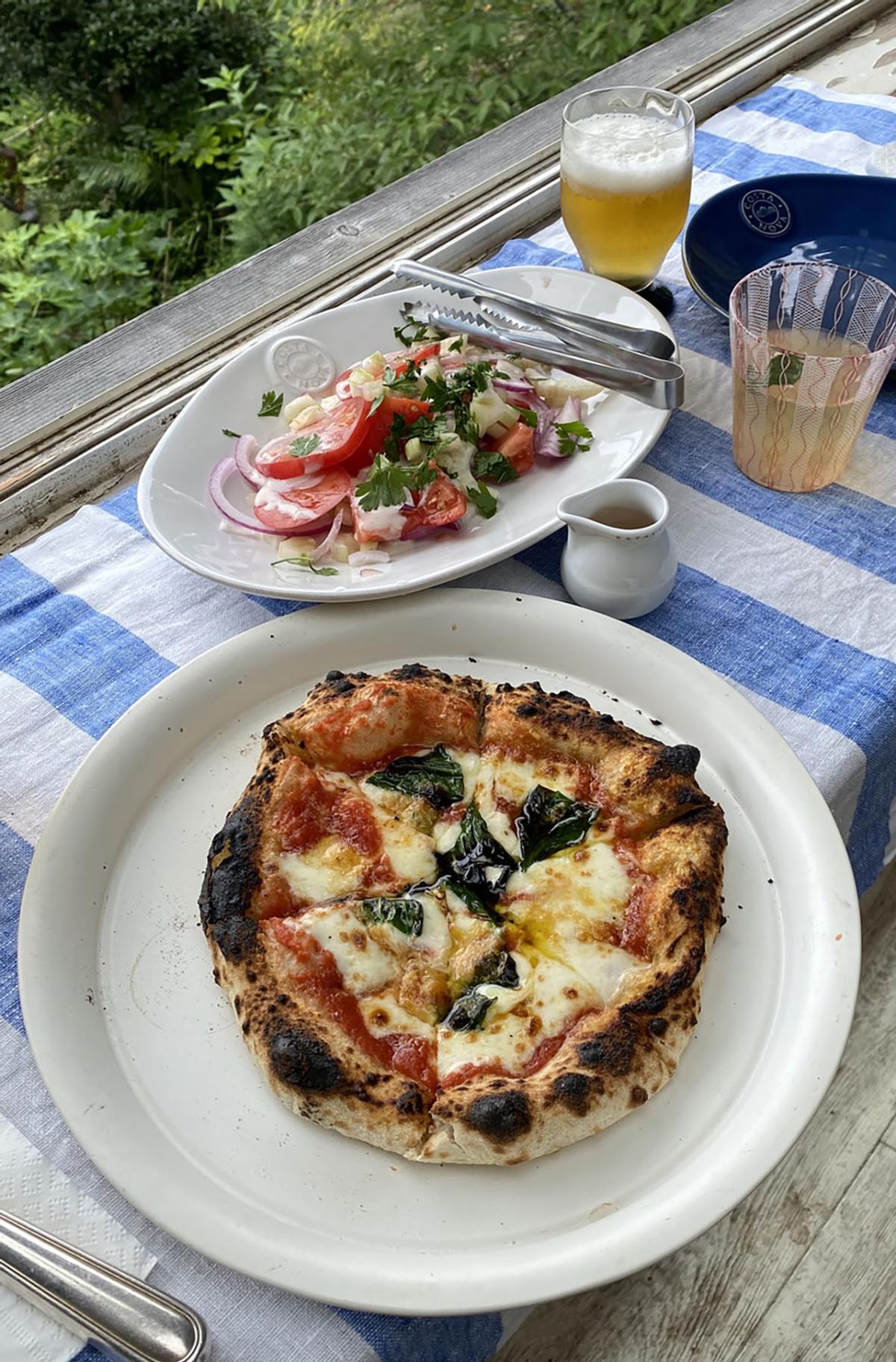 Salade(トマト、セロリ、アーリーレッド、イタリアンパセリ、SAITAMAミルクドレッシング)、トマトエキス、ビール。Pizza(マルゲリータ、ポルチーニと舞茸)。