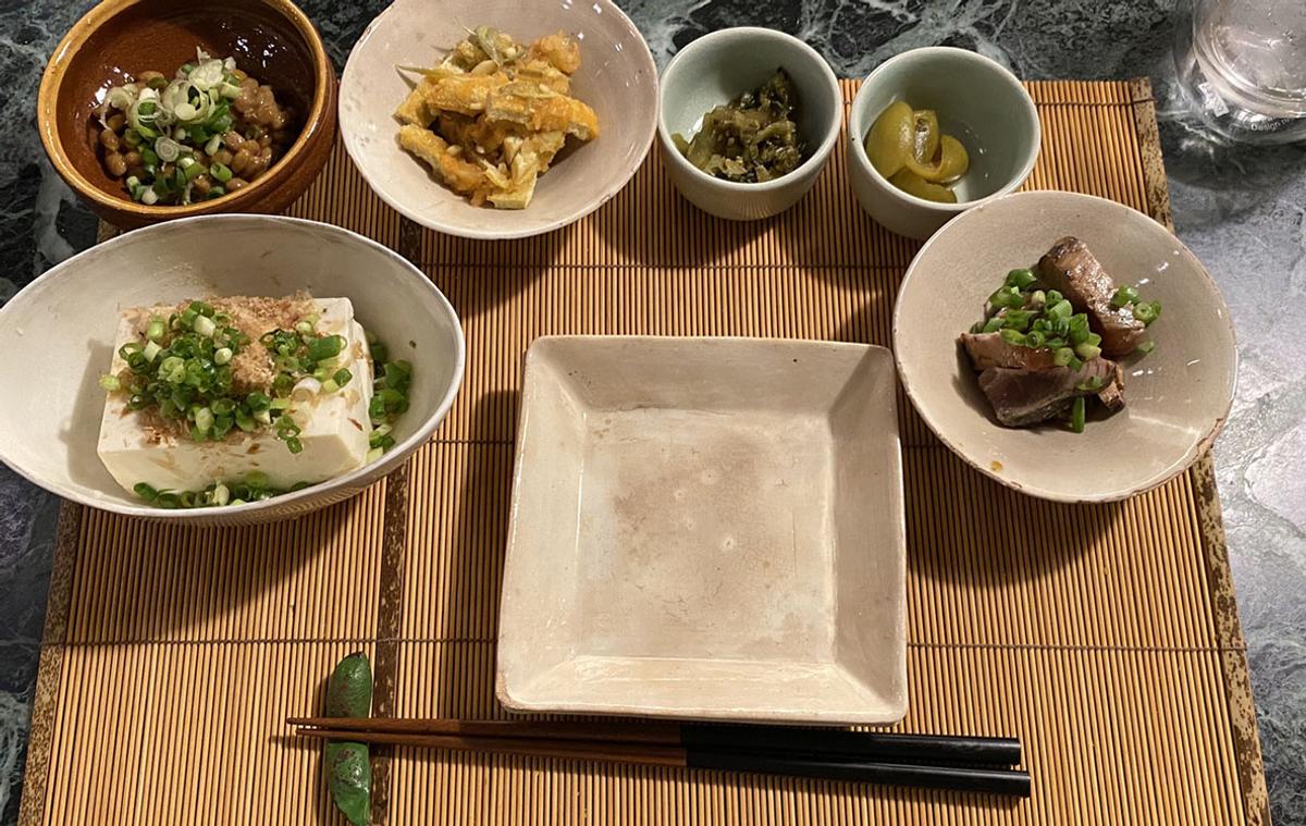 つるっと絹(豆腐)、納豆、秘伝豆の油揚げとミョウガ、鰹のタタキ(ほんの少し)。