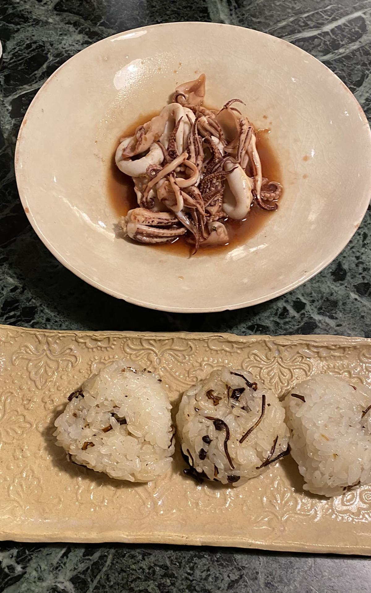 残りご飯に小松昆布を混ぜたチビおにぎり、イカの醤油炒め。