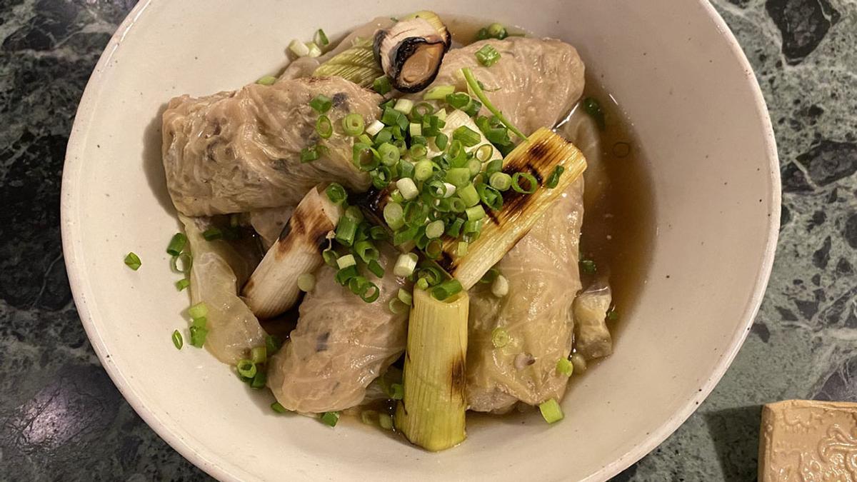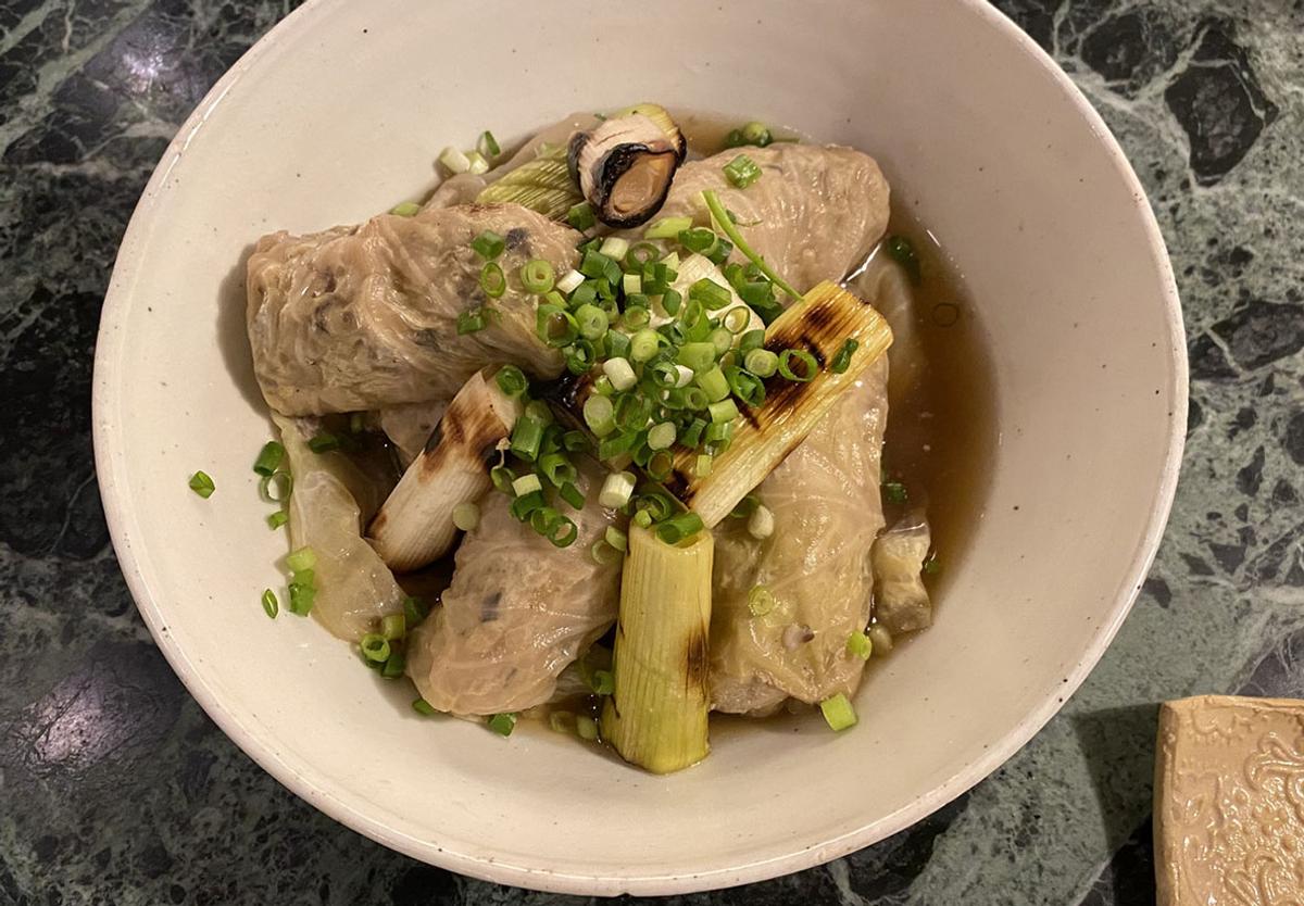 和風ロールキャベツの中身は(豚ばら肉、タマネギ、しいたけ、卵白)。