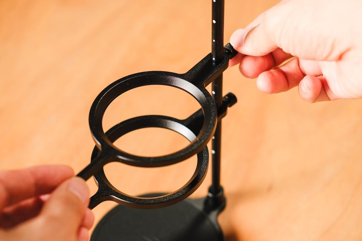 説明書を見ながら、ドリッパートレイ・チリングボールトレイ・残液トレイの3つを、支柱に上から順にセットしていきます。