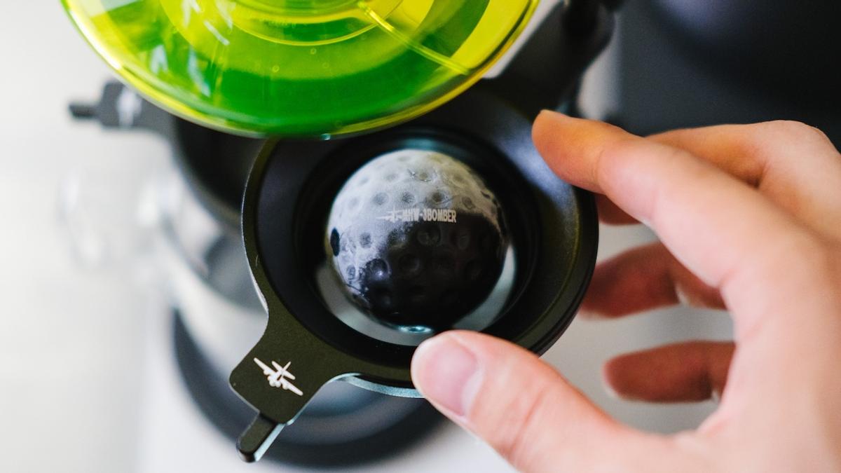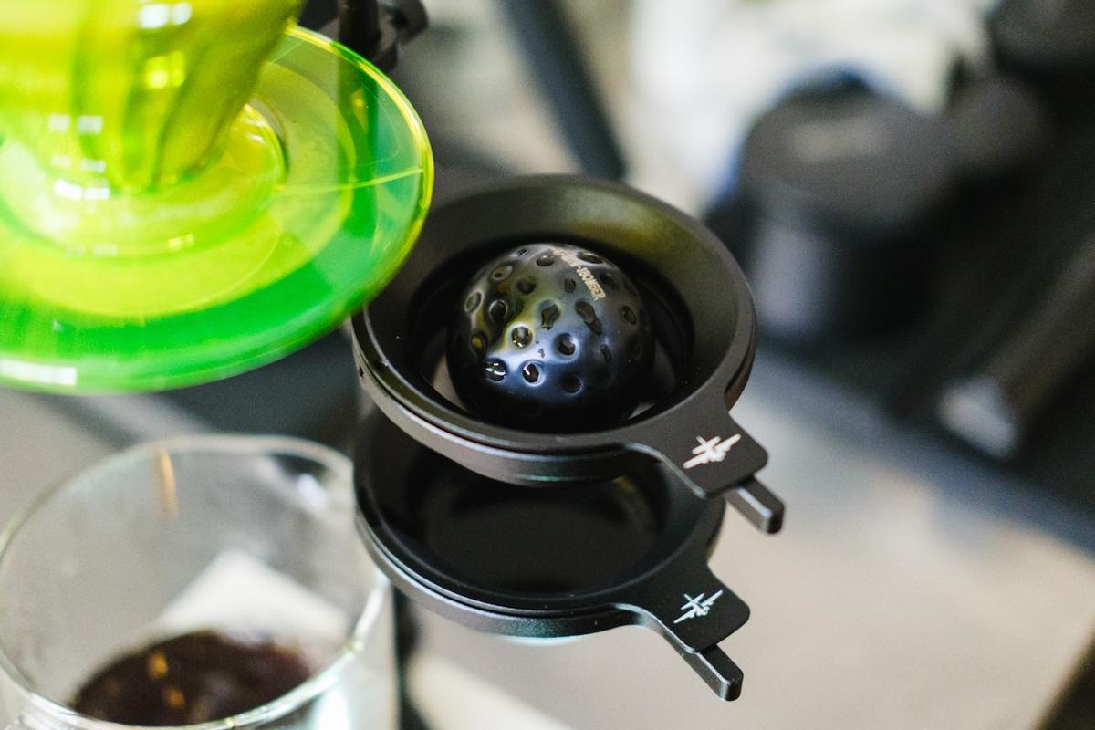 このアイテムは、抽出直後のコーヒーを事前に凍らせた金属製のボールに当てて急冷することで、香りの揮発を防ぐというもの。