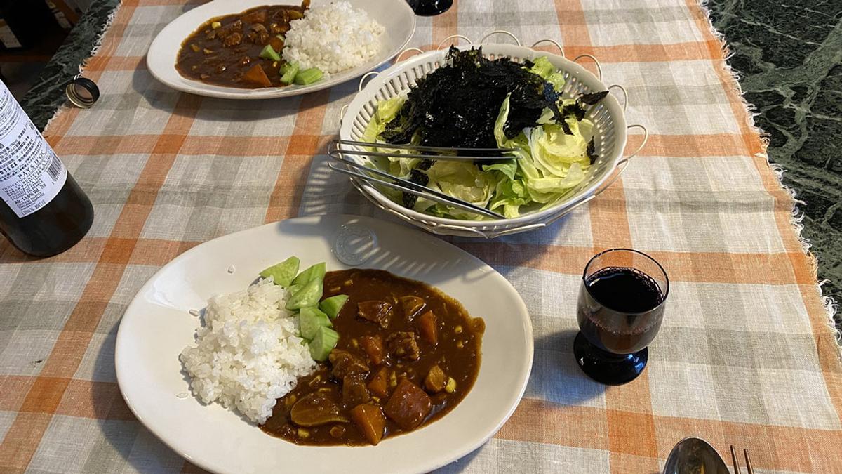 ルーを使った日本風カレーが食べたいなあ、と思った先日、「COSMO直火焼きカレー・ルー・辛口」を買っておいたので、少しアレンジして(クミンシード、ニンニクと生姜のみじん切り、バターを加えた)作った。辛味が足りなかったので、ペペロンチーノoilをプラス。具材は豚の肩ロース、ズッキーニ、人参、エリンギ、玉ねぎのみじん切り。想像していたより穏やか味のカレーが完成。ほかの料理はレタスと韓国海苔のサラダだけ。