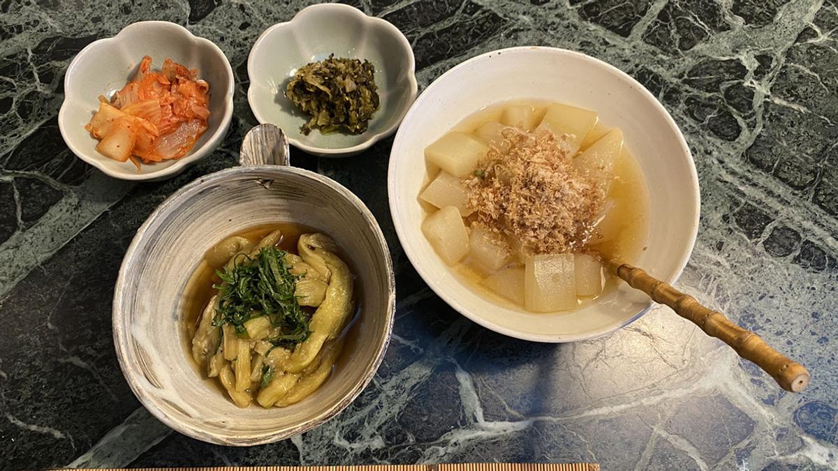 焼きなす(おろし生姜とシソ、おひたし)、冬瓜の煮物(冷製:花かつお)、白菜キムチ、高菜の漬物。