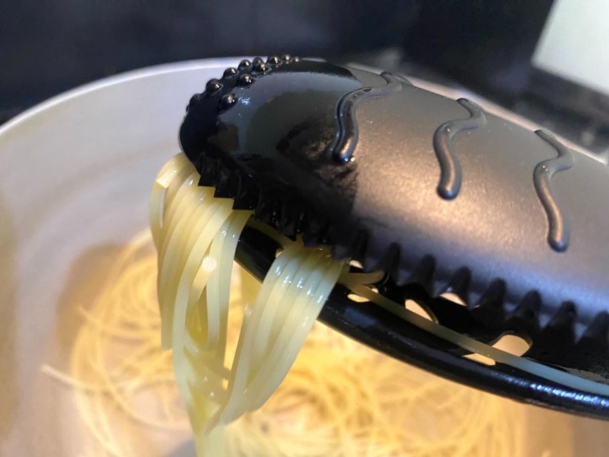 さらに、先端には小さな穴があいているので、湯切りもできるんです。