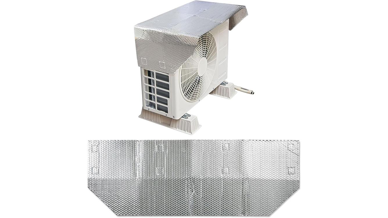 室外機に被せるだけで、アルミ素材で熱線をカットし、エアコン効率をアップさせる便利なアイテムなんですよ。