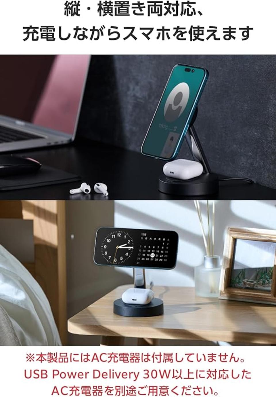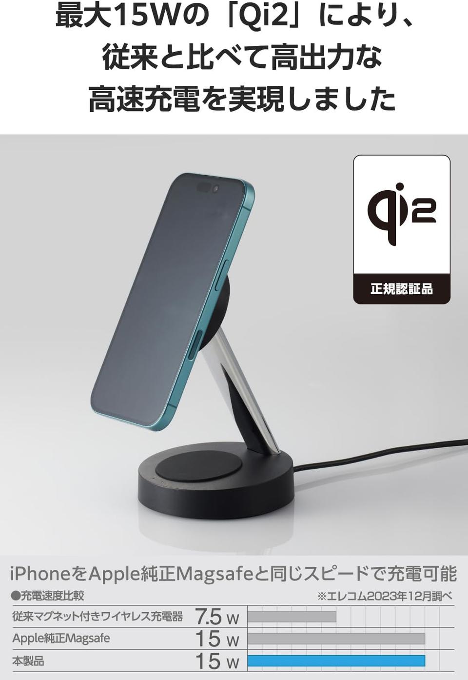 そこで今回は、マグネットで固定するだけでQi2対応スマートフォンと対応するAirPodsを同時に充電できる、ELECOM(エレコム)のQi2認証ワイヤレス充電スタンドを紹介します。