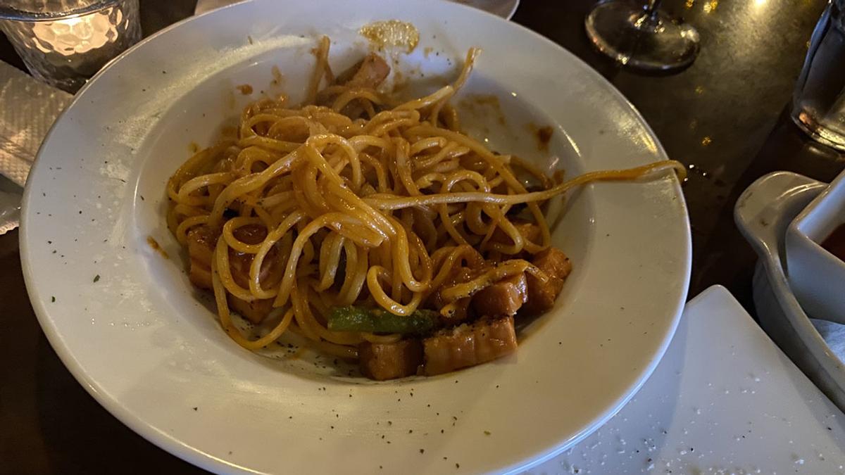 スパゲッティ・ナポリタン&スパゲッティ・明太子と海苔。白ワイン。何年も食べていなかった、昔懐かしい、喫茶店のイタリアンでありました。