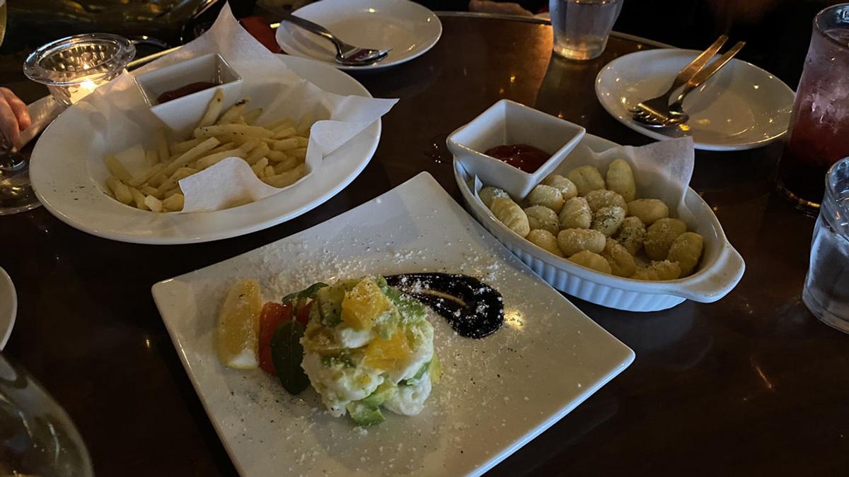 桜丘カフェで恩ちゃん&まーこと待ち合わせ。「続・こころ躍らナイト」の開演前に何か食べておこう、というわけである。ポテトフライ、ニョッキフライ、ポテトサラダ、