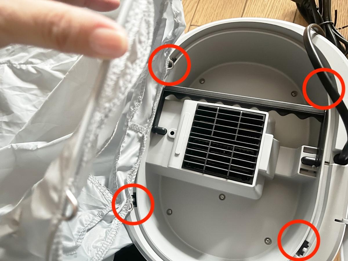 本体の蓋を開けると、電源コードと衣類を覆う専用乾燥カバーがセットで入っているので、まずはこちらを取り出します。