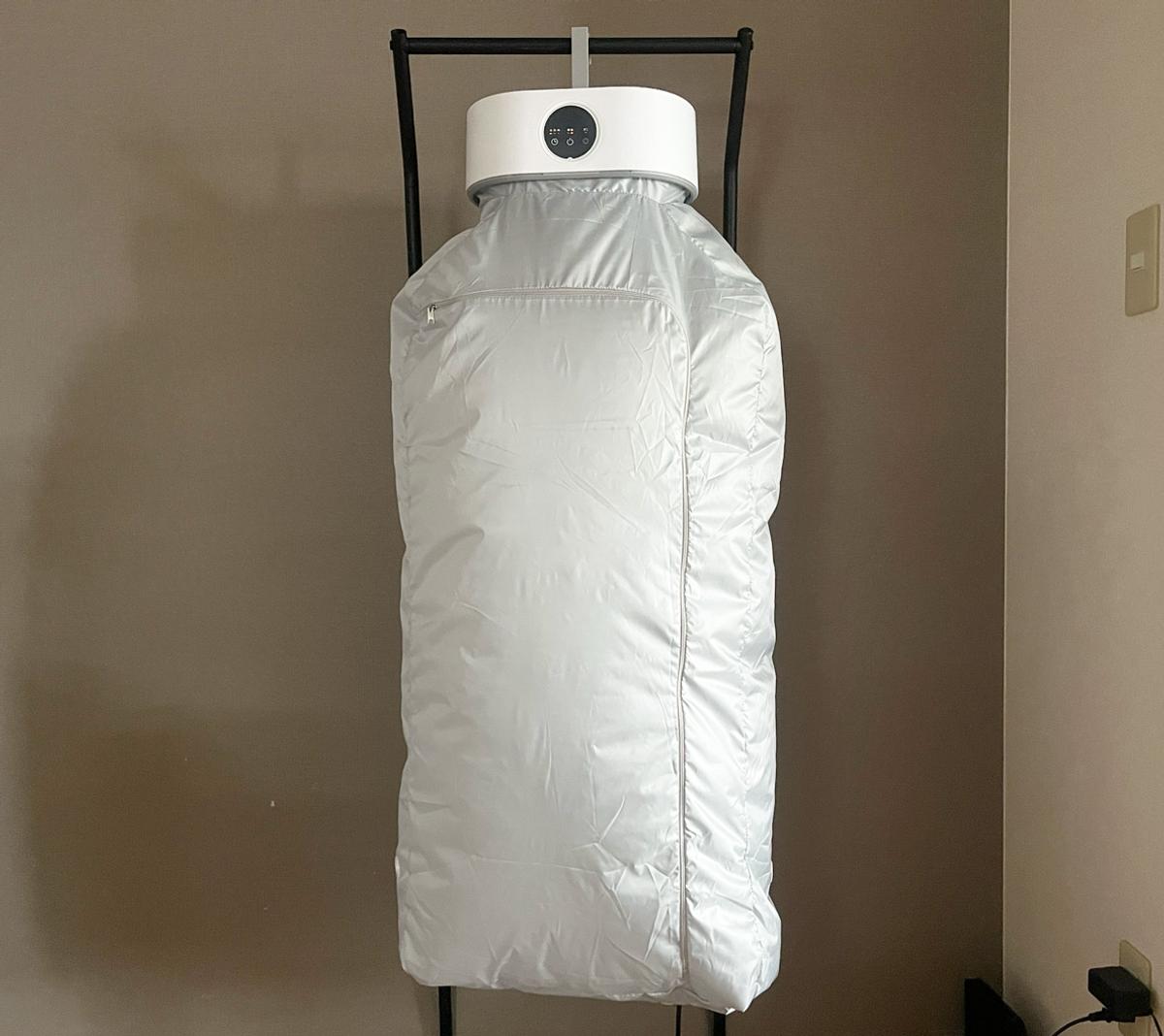 チャックをしっかり閉じたら、スイッチをON! 本体から排出された温風が乾燥カバーの中で対流し、衣類の水分を飛ばしていきます。